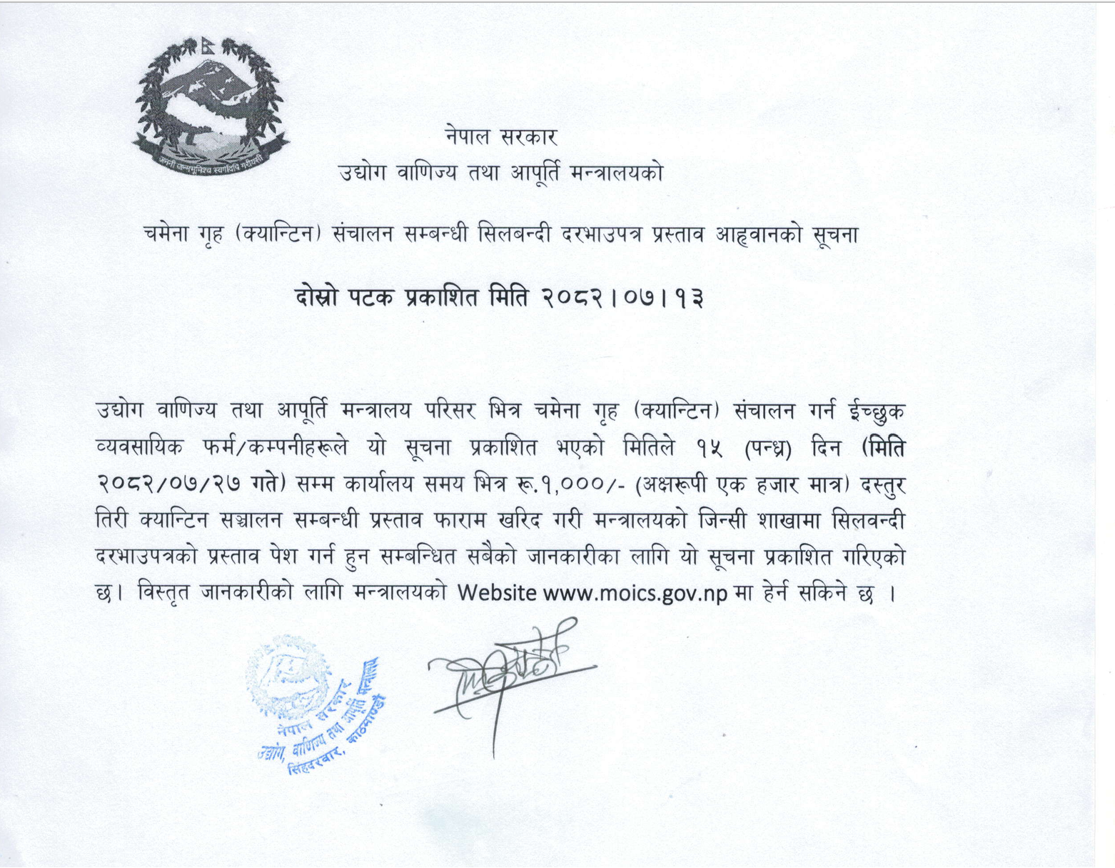 चमेनागृह सञ्चालन सम्बन्धी सिवबन्दी दरभाउपत्र आह्वानको पुन: सूचना